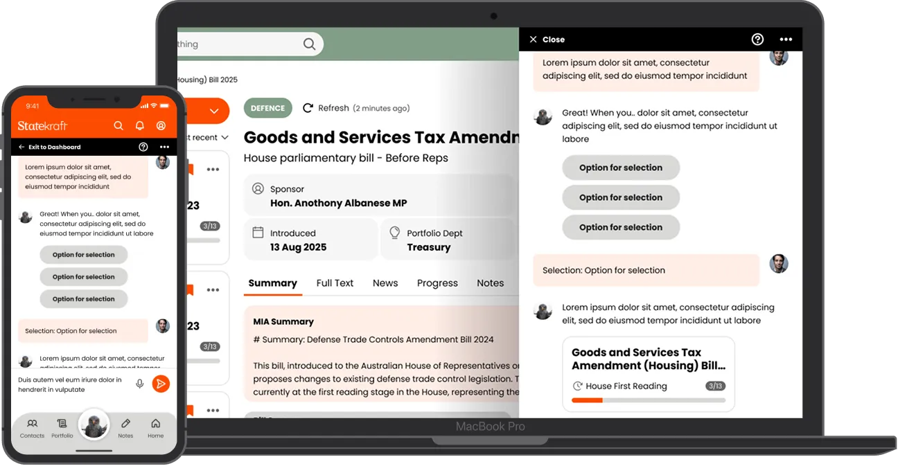 You're better than a human search engine. Yet the average Australian political staffer spends 15+ hours weekly manually tracking what’s happening in and out of Parliament and their electoral office. Statekraft eliminates this inefficiency while also delivering enhanced intelligence for you and the boss, building on what has come before and anticipating what you need next.