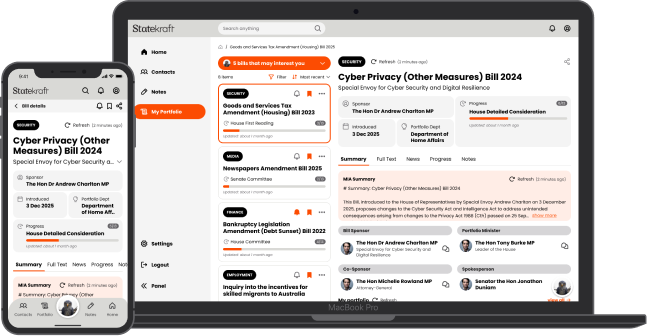 Using your chosen topics and issues, Statekraft enables you to track policy development and consultation, bills and amendments, committee hearings and inquiries, when Bills become law, reviews including Royal Commissions, and regulations, instruments and rules - all in one place.